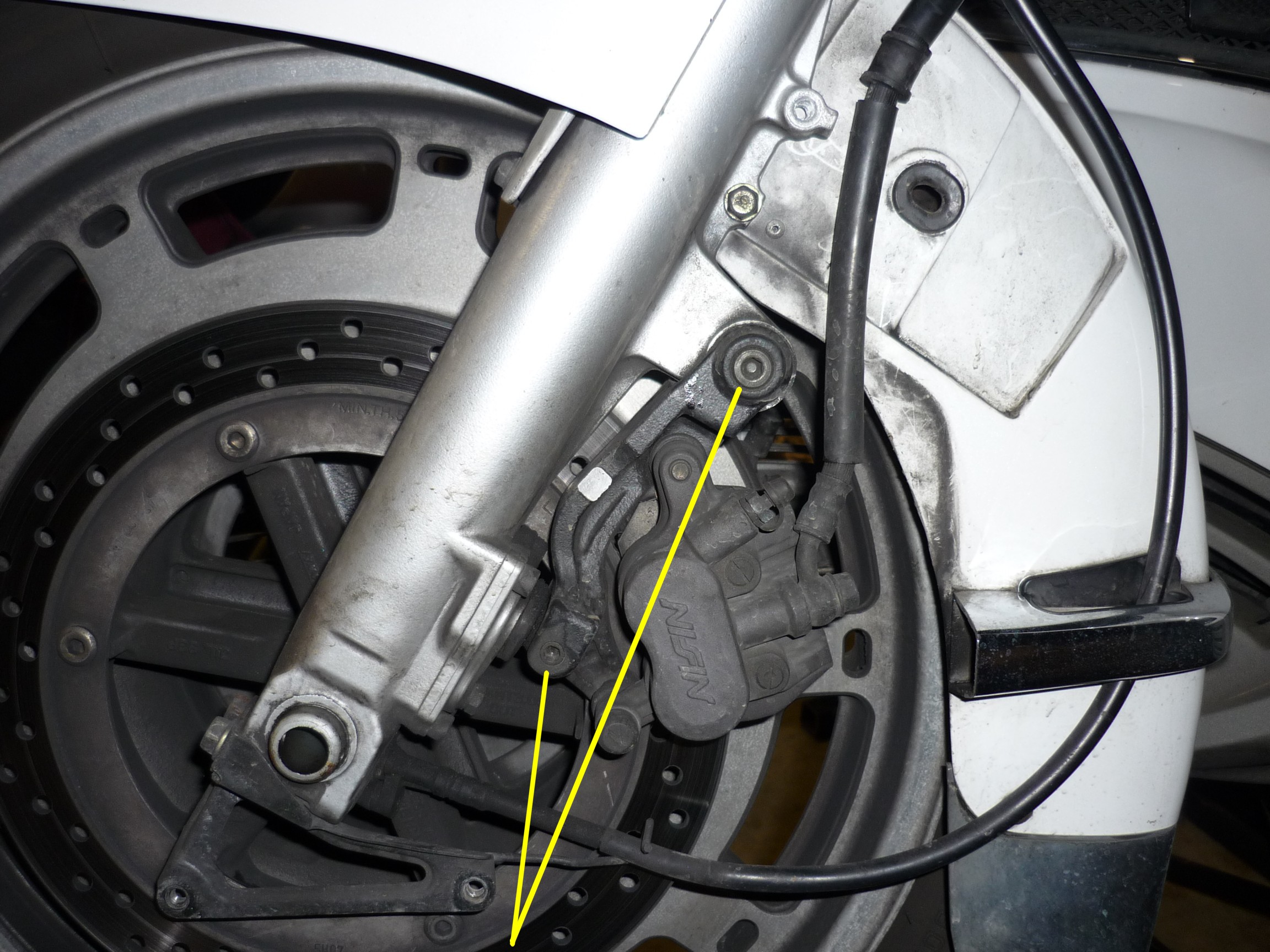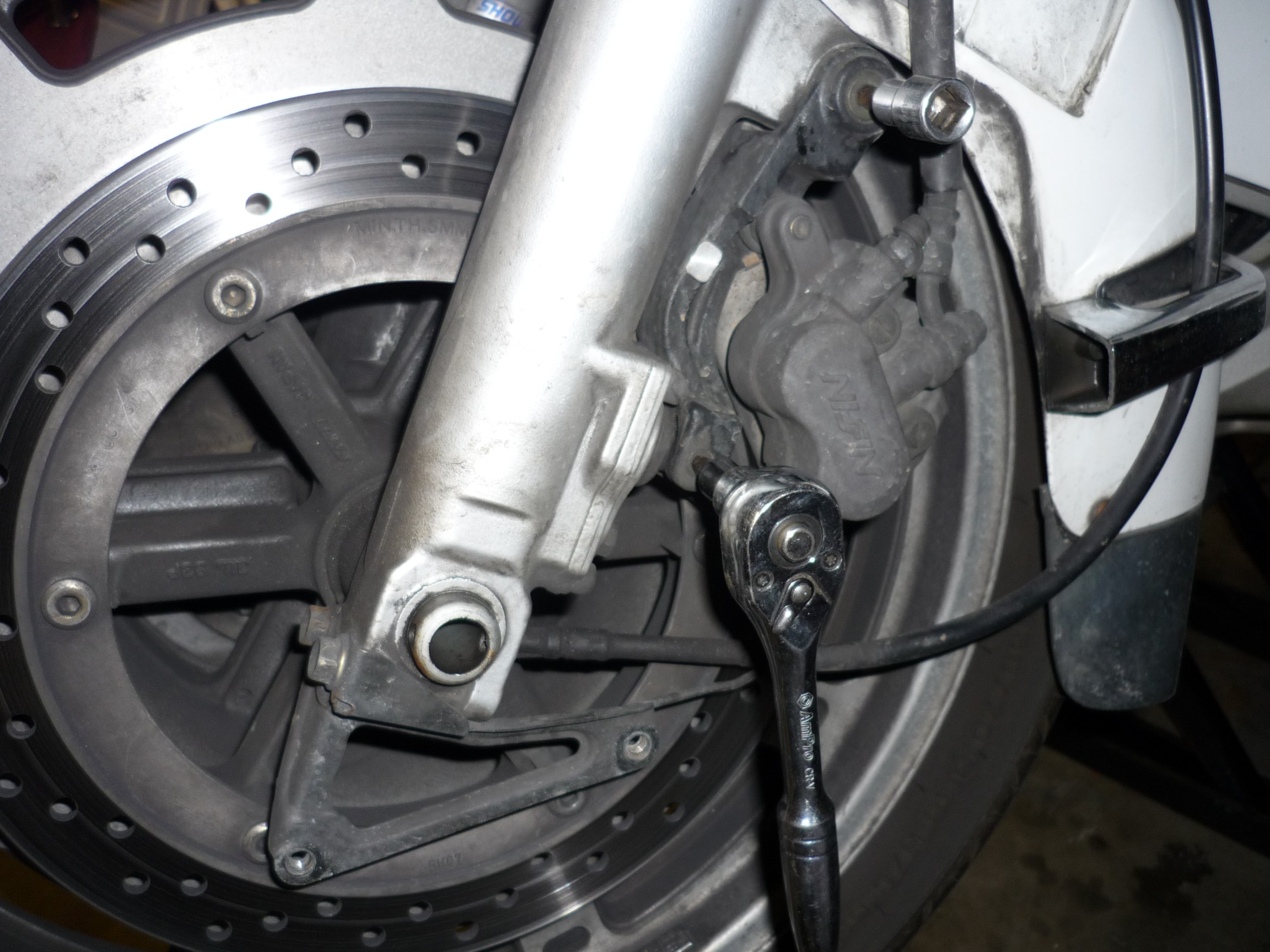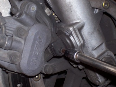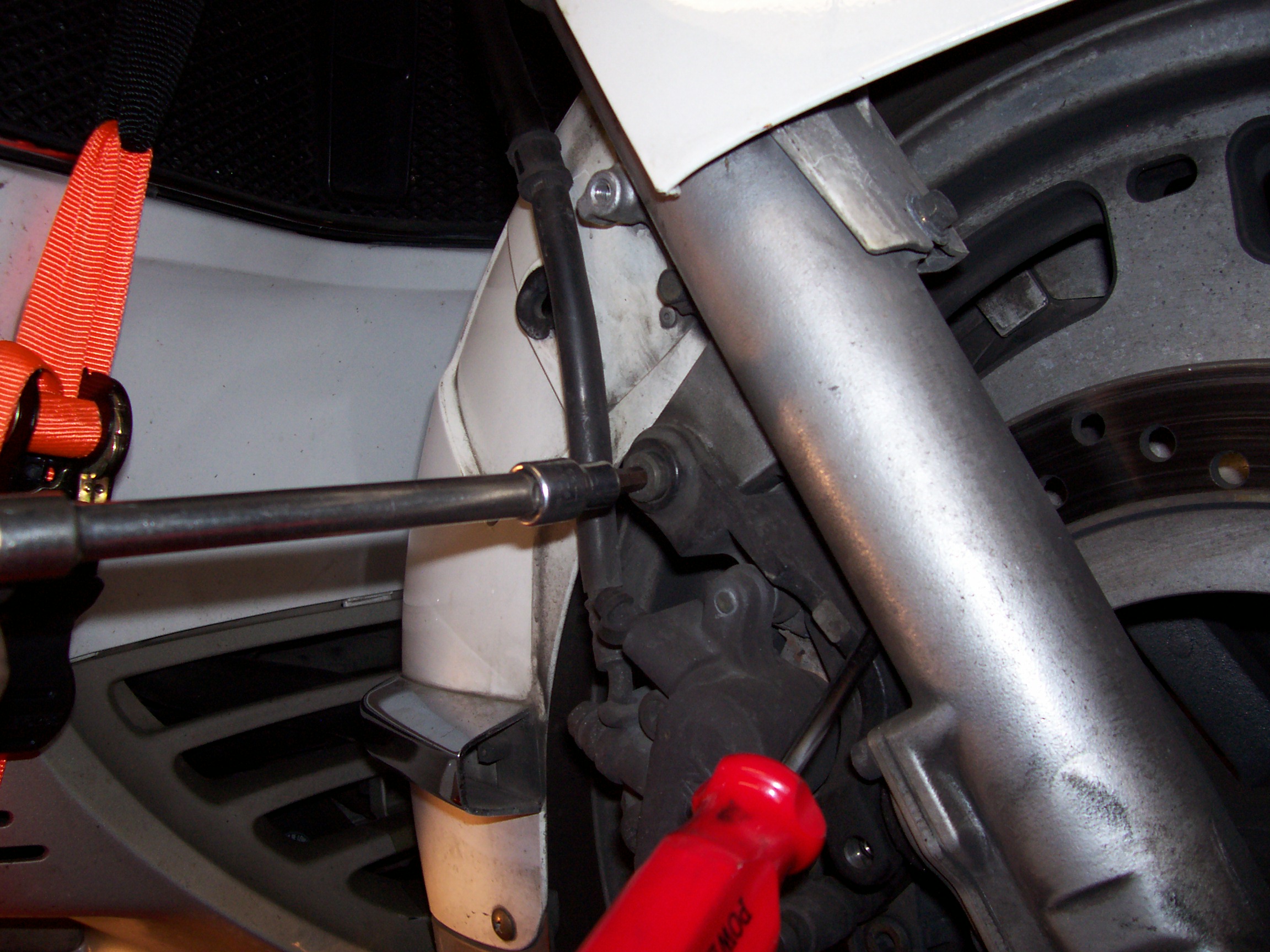 On the right side, I used a screw driver between the caliper and the fork tube to protect the anti-dive. |