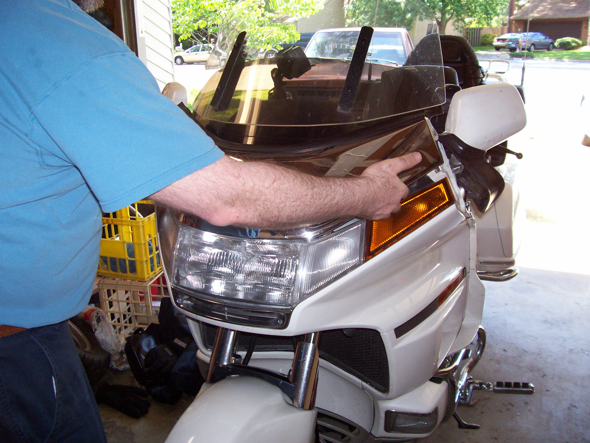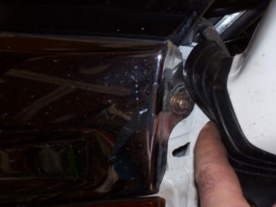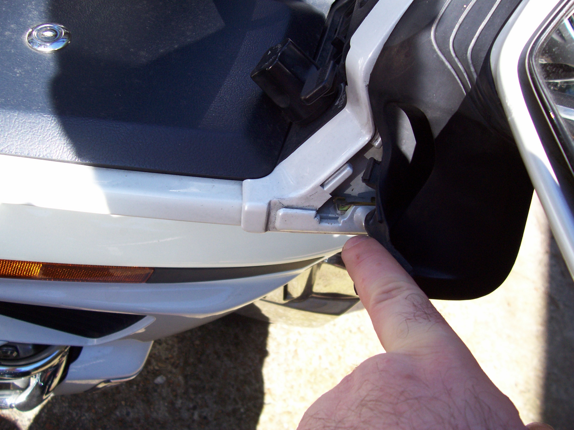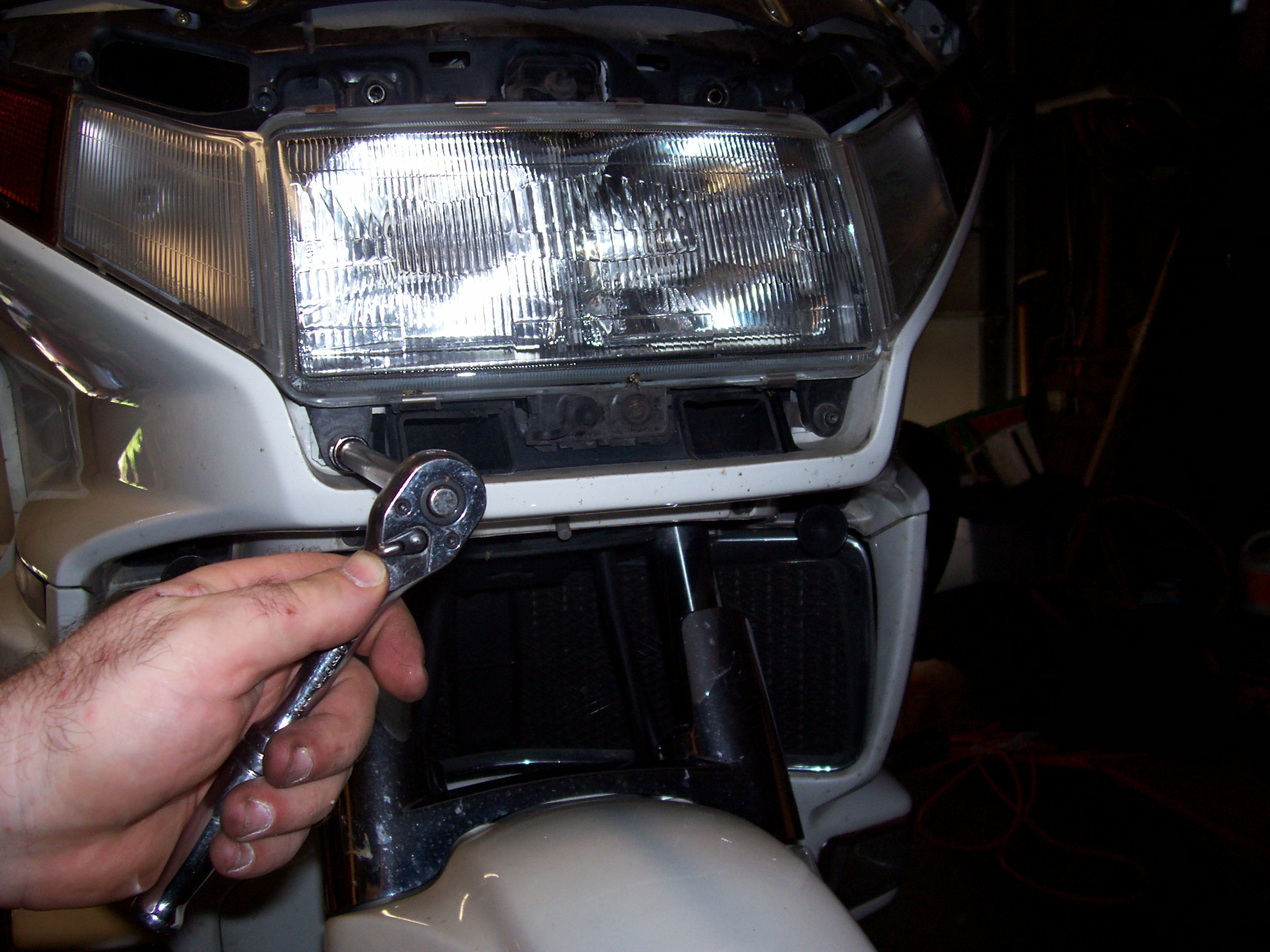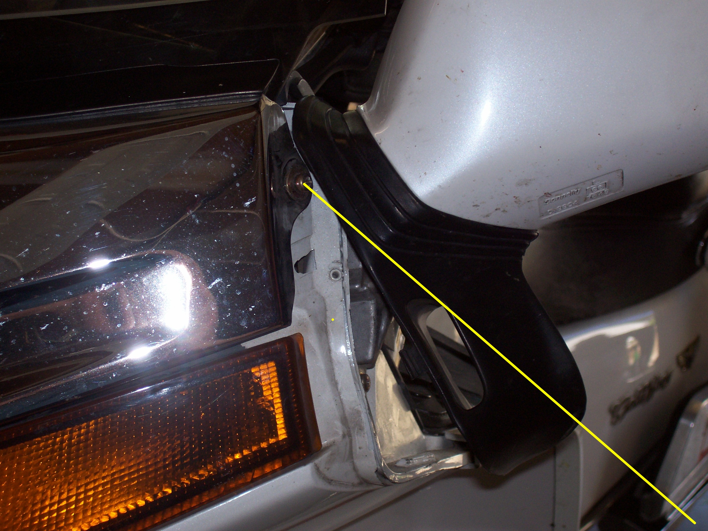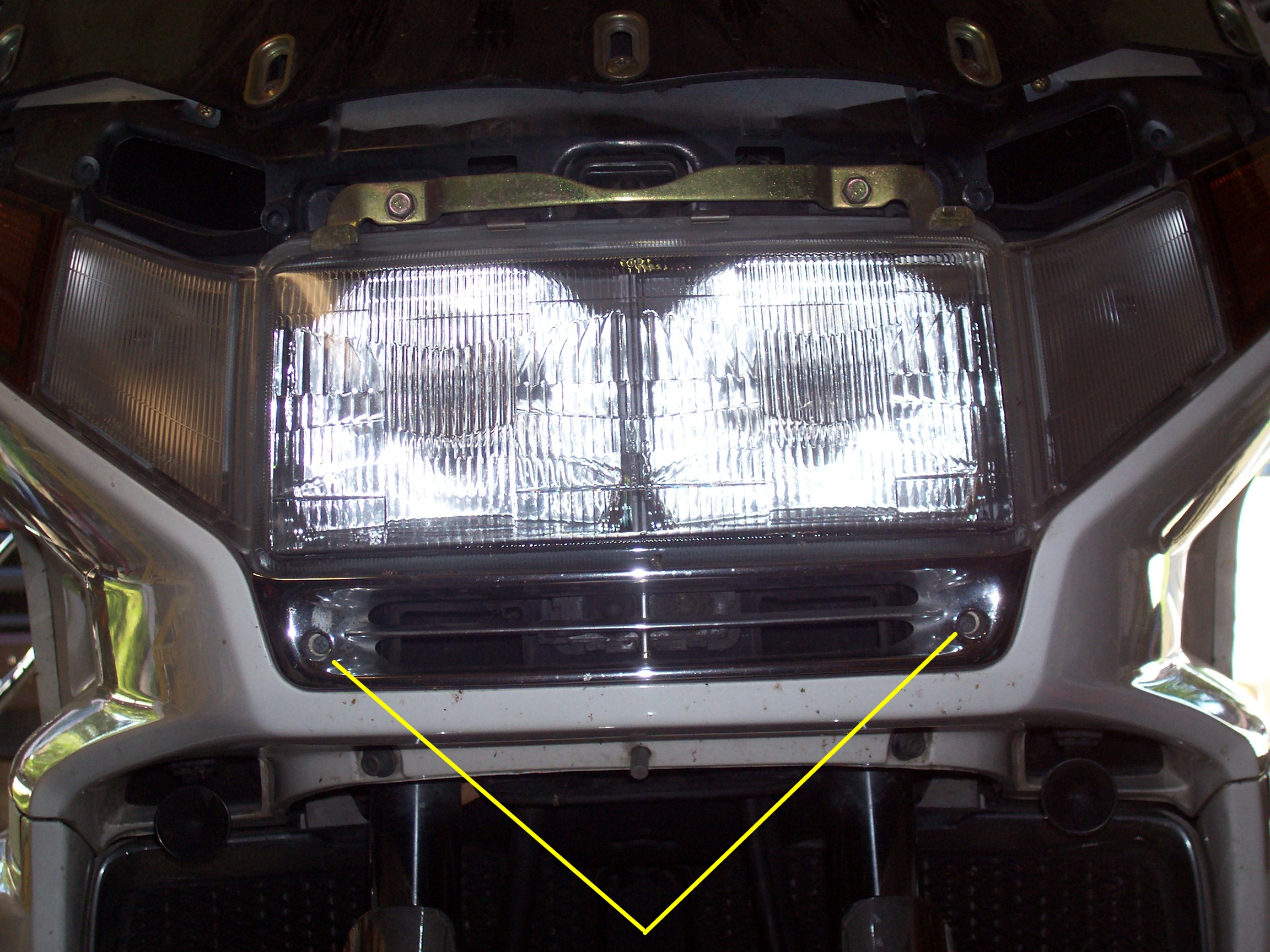 There is a screw on each end of the front chrome trim. It is located under the mirror rubber boot. So starting with the mirrors, loosen the rubber boot from the bezel and then remove the bezel. You might be able to work the bezel around and remove the needed screw with out removing the bezel, however, I have enough chips and scratches in mine, so I removed it.|