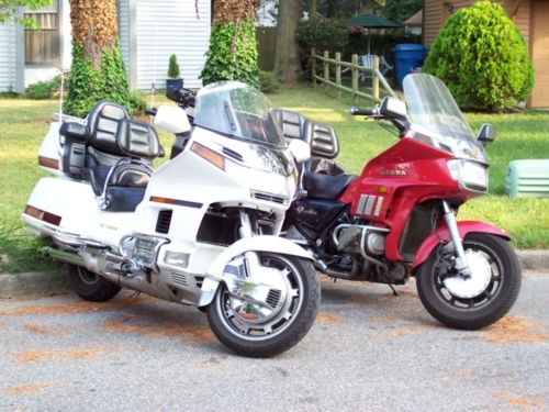 These are my bikes. The red one is a 1985 Honda Goldwing 1200 Interstate.