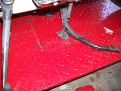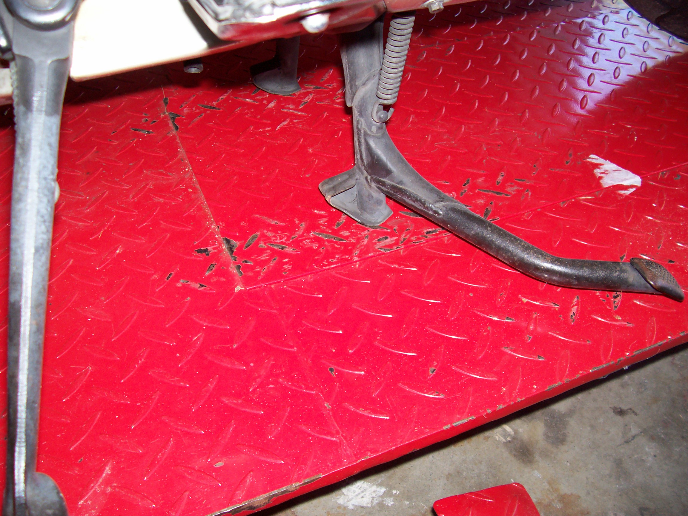 WARNING: REMEMBER TO ALWAYS PUT THE SIDESTAND UP. THE SIDE STAND WILL (MAY) HIT THE RAMP AND PUSH THE BIKE OVER TO THE RIGHT. IT WILL GO ALL THE WAY OVER. THE ENGINE GUARDS WILL NOT STOP THE BIKE UNTIL THE BIKE IS ALL THE WAY OVER ON THE GARAGE FLOOR. IT WILL BE PAST THE 45 DEGREE ANGLE. IT WILL BE ALL THE WAY OVER.