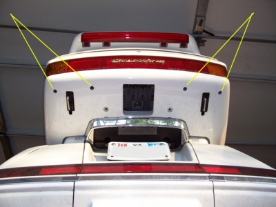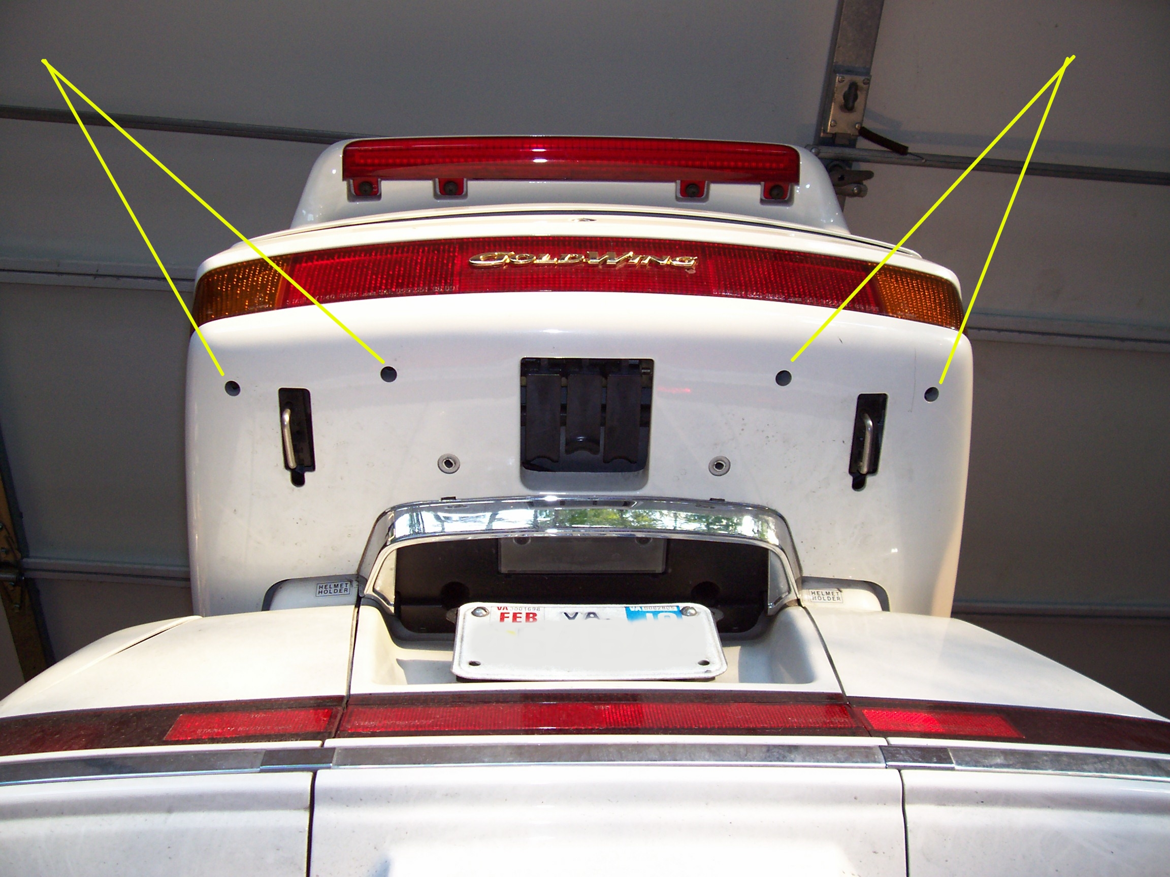 The trunk lower cowl needs to come off in order to remove the saddle bags. The arrows show the 4 screws that hold it on. |