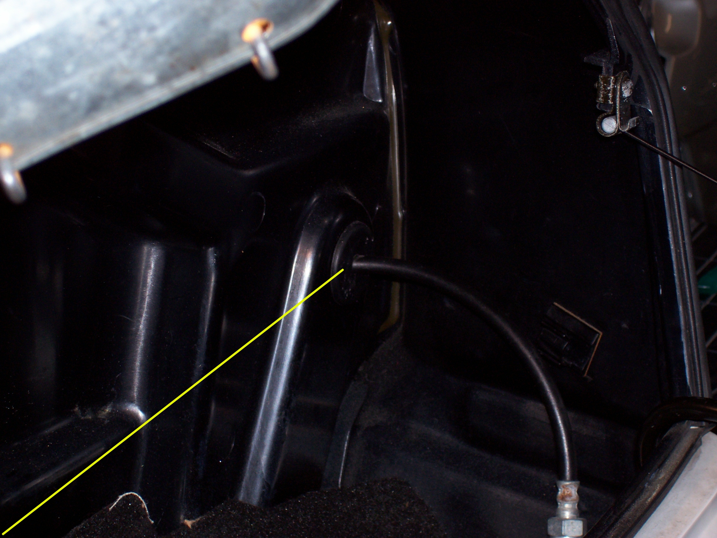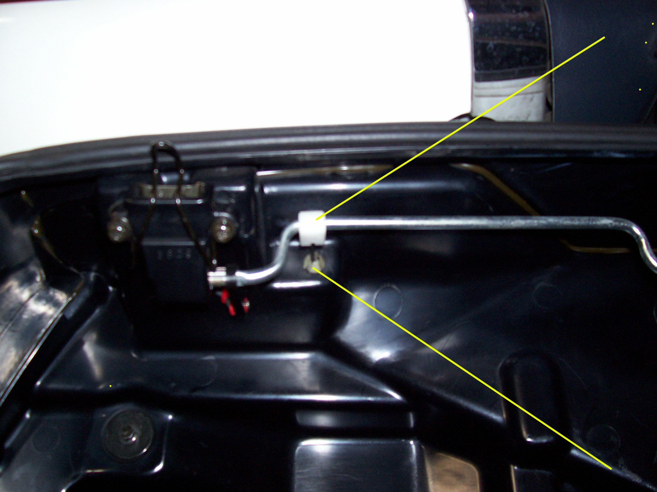 Next, inside the saddle bag, disconnect the release cable. There is a little white plastic clip that just clips on the bar. Slide it off. Then rotate the clip to line the slot up with the cable and remove the clip from the cable. Then push the cable out the hole. It is held in place by 4 tabs.