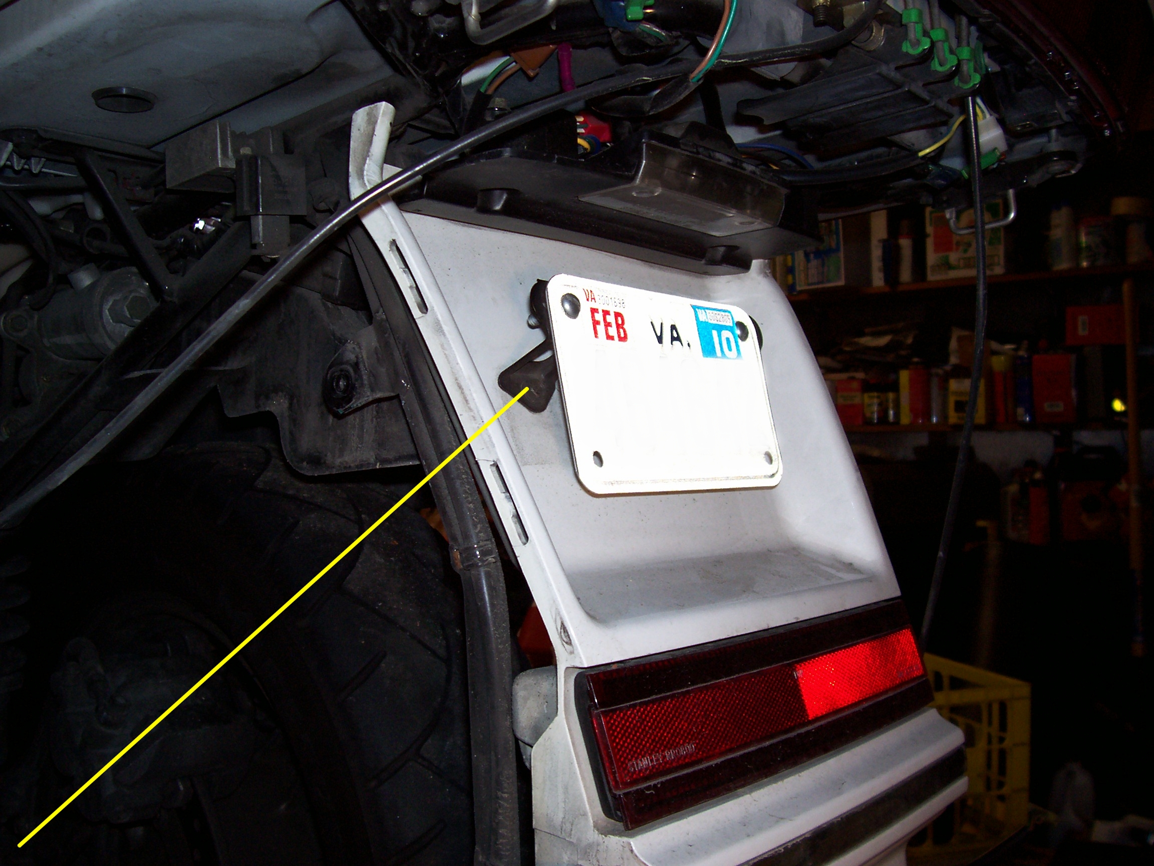 If you are doing the bike on the ground, you'll need to remove the center fender. Since I have a trailer hitch, I left mine in place. But there are two screws under the license plate. Then there is a horizontal support bar that needs to be removed. This will give you access to the rear to remove the tire through.