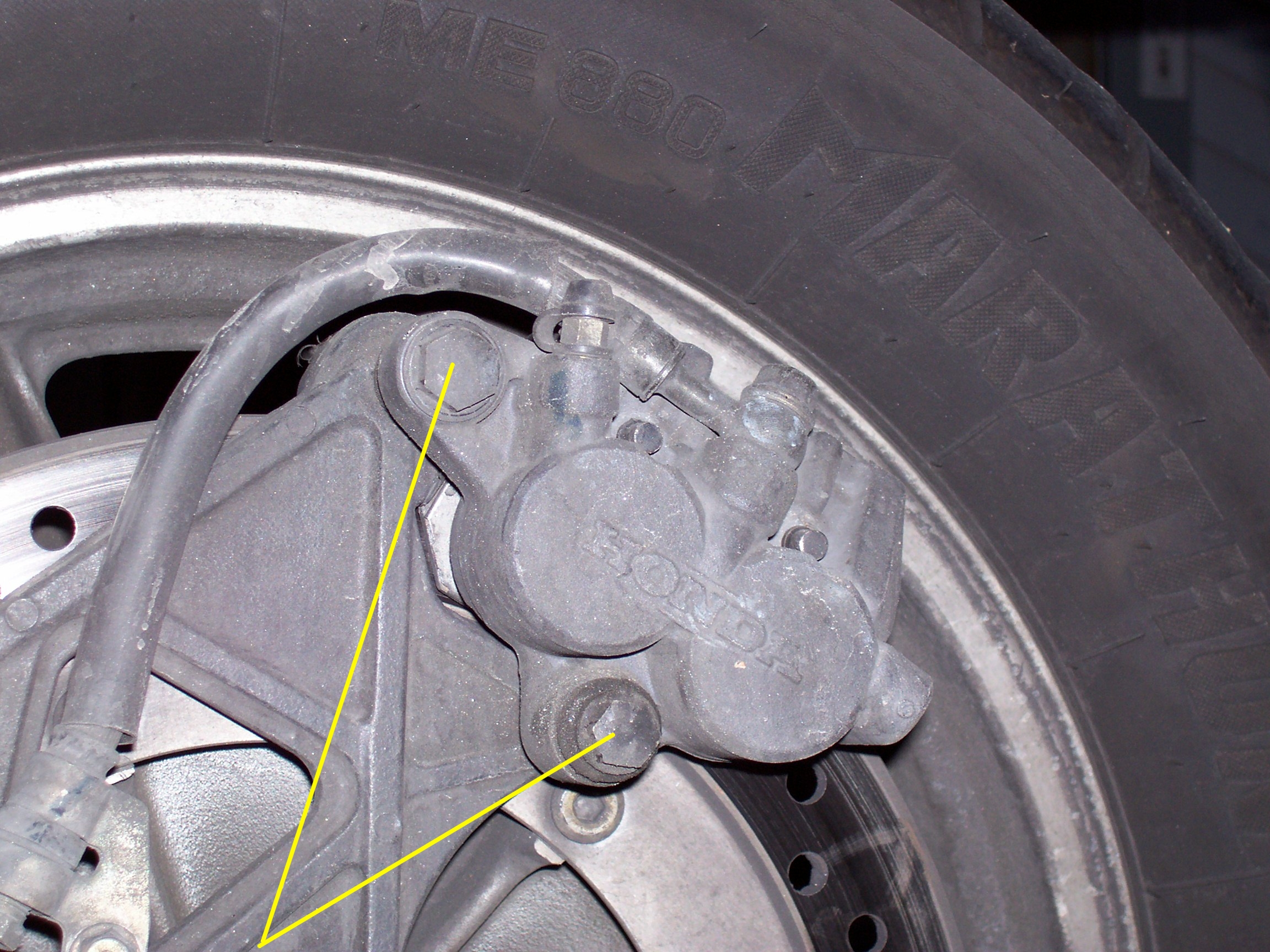 Caliper slide bolts. Remove both bolts to remove caliper.