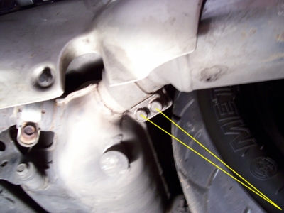 With out a trailer hitch, you can remove this bolt. With a trailer hitch, you will have to push the muffler inward to clear the bolt. Then push the muffler down. It should only need to drop a couple inches, and that's about all you will be able to push it down. It only needs to move down enough to be able to slide the axle out. Mine wouldn't go down enough and stay there. I had to hold it down with one hand while pulling the axle out with the other hand. We aren't that far yet, so only push it down enough to make sure that it is moveable.