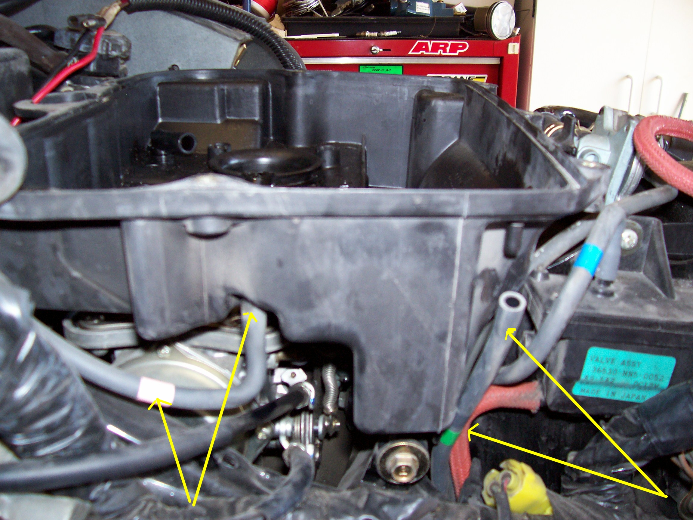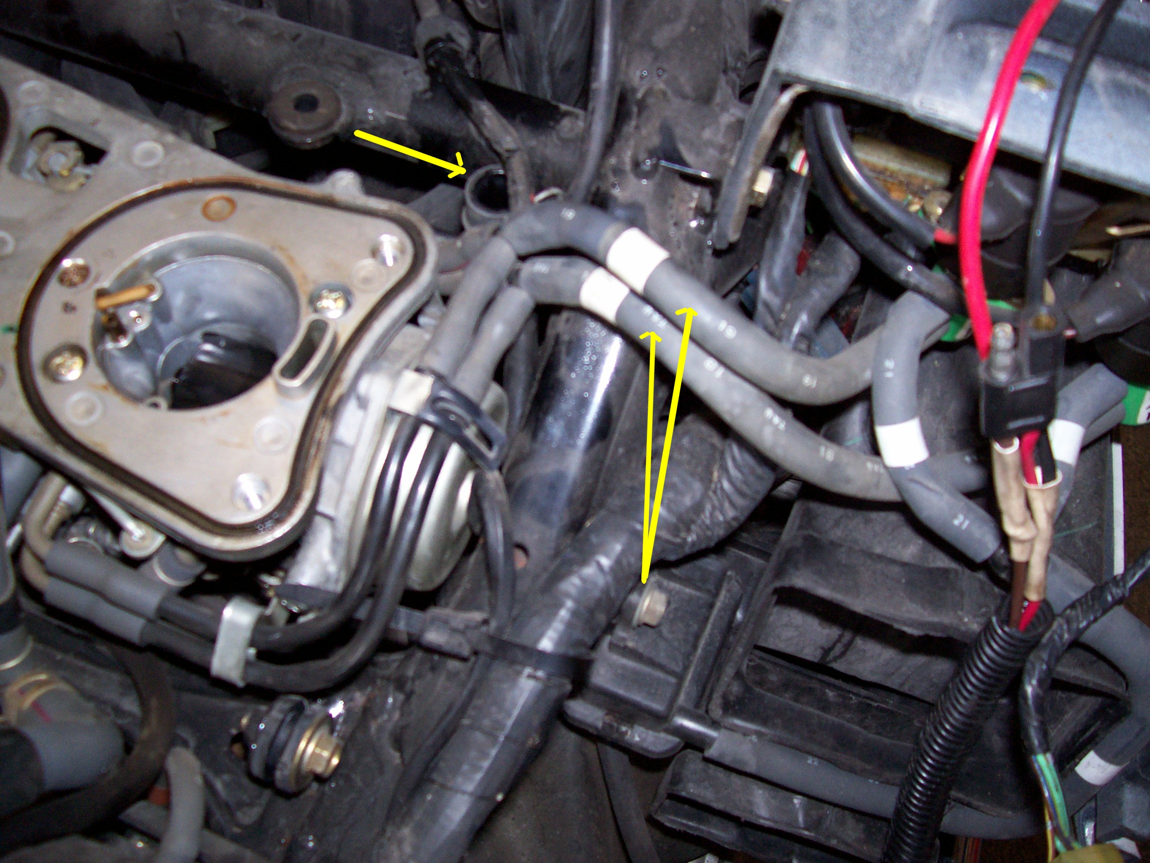 Here's the tough part of it. There isn't enough room to work, so the hoses and the bar get in the way. Disconnect the vacuum hoses at the arrows to give yourself more working room. The bar you just have to live with.