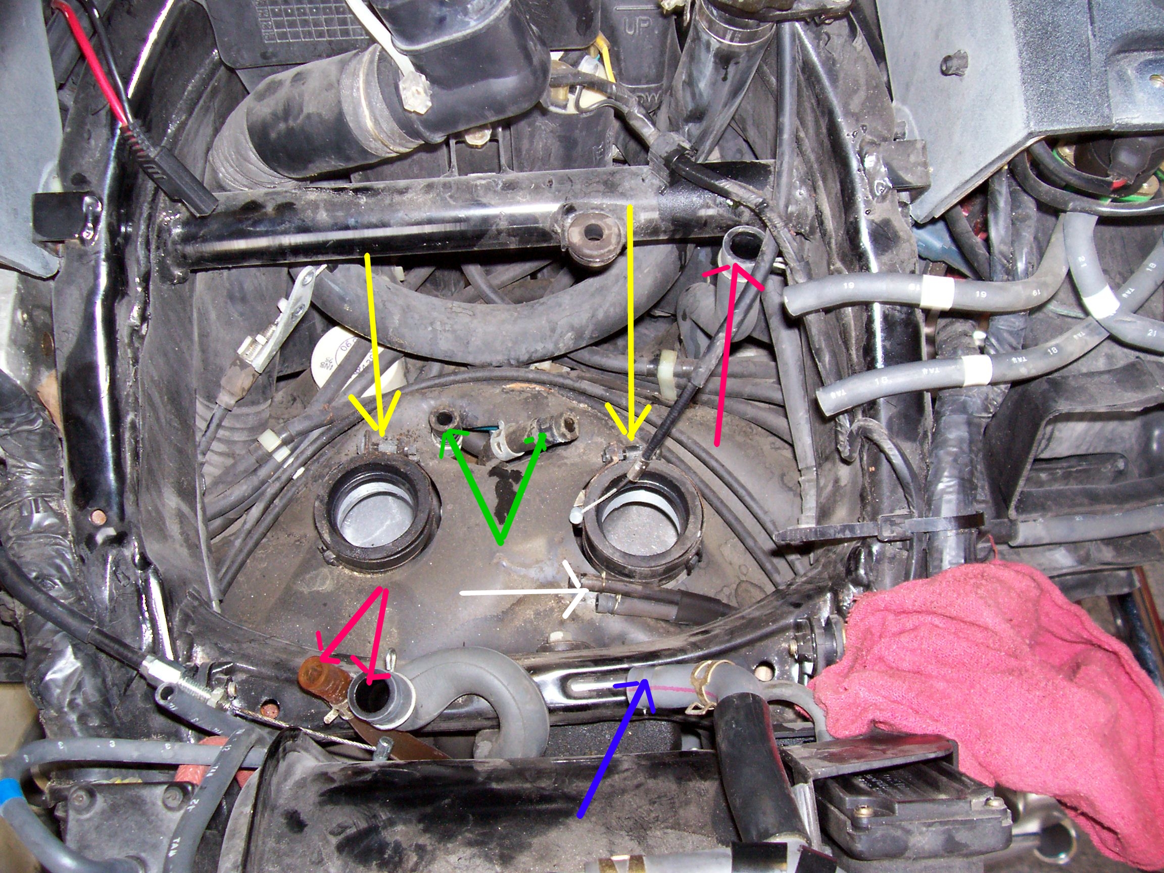 In all there are 3 hoses that make this job a real bitch. The one on the front right corner of the air box, and there are two antifreeze hoses that go to the front of the carburetors. (And I didn't get any pictures of any of these 3, sorry). If you don't cuss, after this job you will cuss like a sailor because of these 3. There isn't any slack in any of these 3 so you will suffer because you don't have any space to work between the pan and the bike frame/parts.