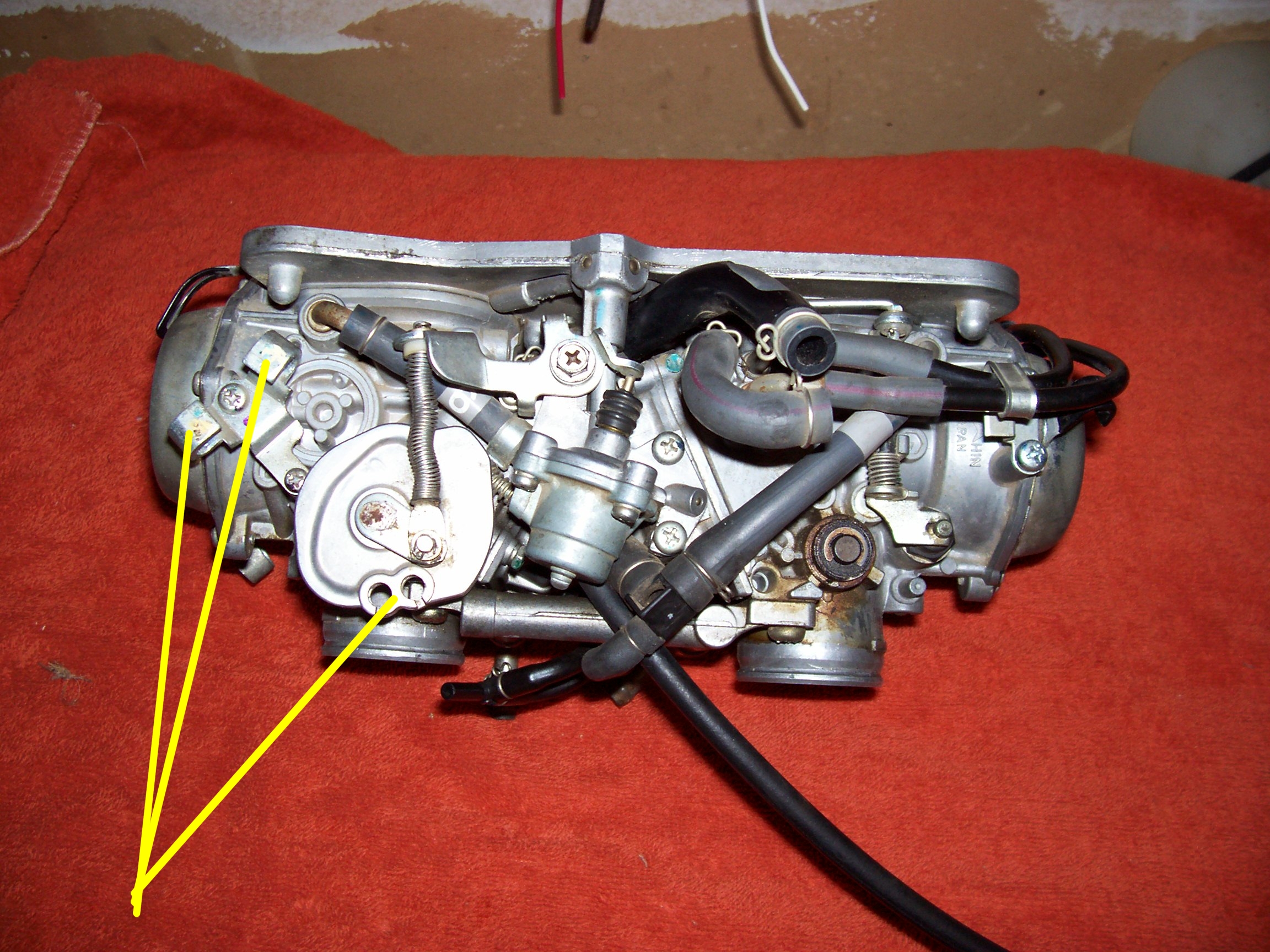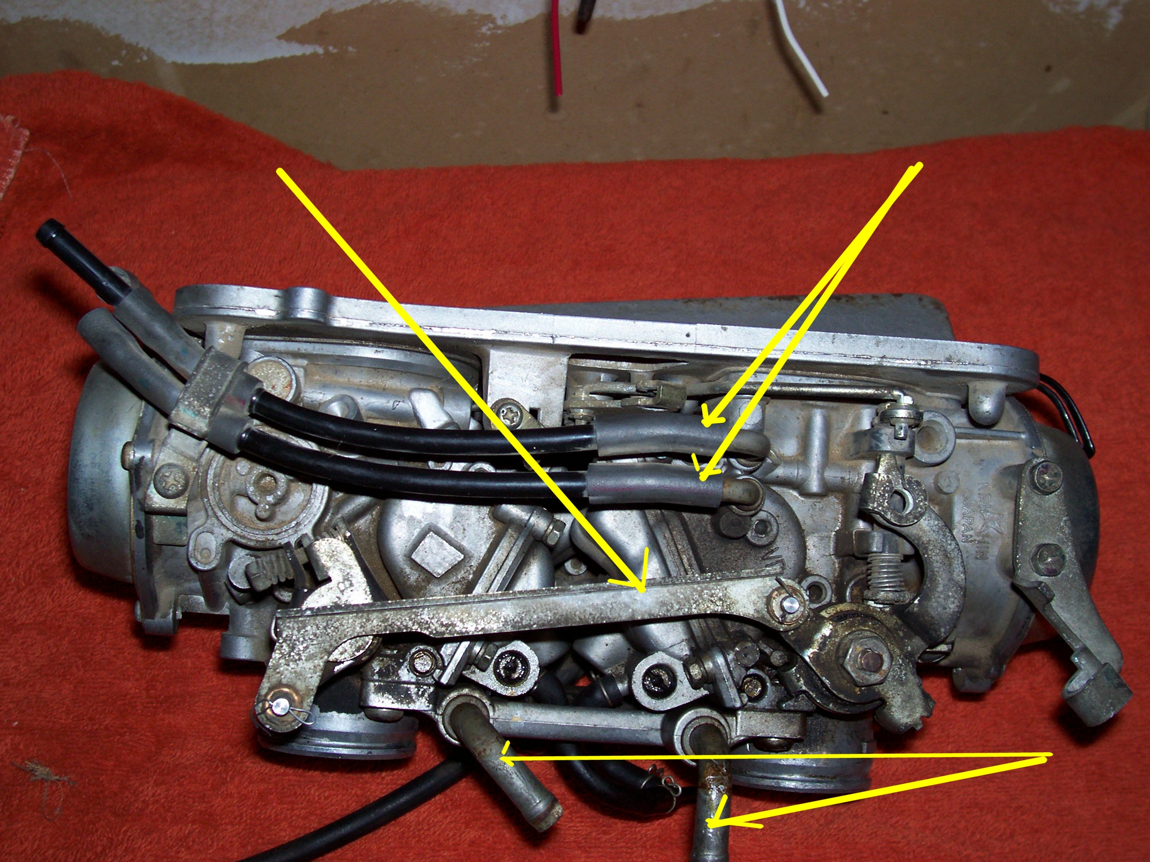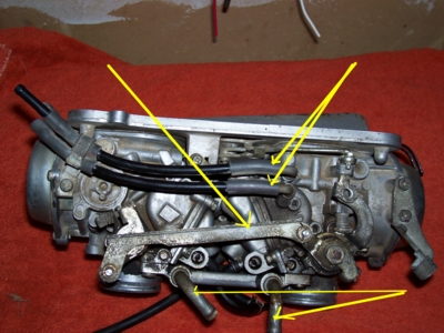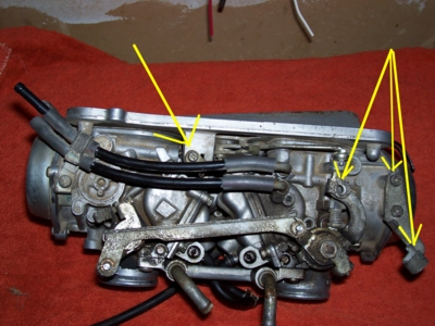 The single arrow on the left (the right side of the carbs) points to the bracket that holds the choke cable. The bracket is spun down in this picture and hiding behind the hoses. But you can see the screw. Remove the choke cable.