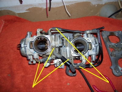 Note: the nipples that the hoses go onto are tapered and do not have a lip. The clamps barely hold these on. I knocked the hoses off twice when putting the carbs back into the bike. You have been warned.