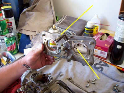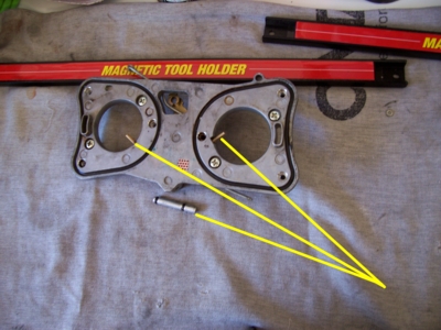 Another view of the top plate. The arrows point to the above mentioned tube now removed, and to the accelerator pump nozzles.