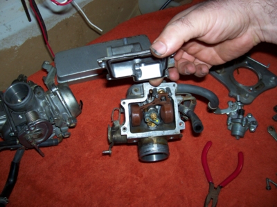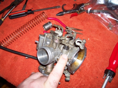 Remove the 4 screws from the cover. Watch the spring, it will come flying out. Remove the spring. Then remove the throttle valve. Note for reassembly: when removing the throttle valve, notice that on the edge of the diaphragm there is a small loop of rubber. Notice in the grove that it sits in, there is a small notch for it to sit in. These must match up when you reinstall in order for the vacuum to properly open the valve.