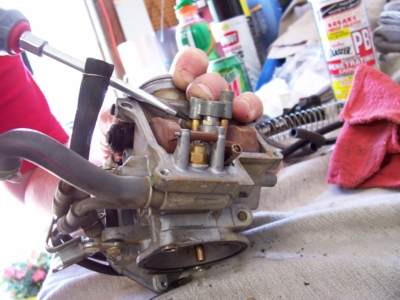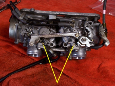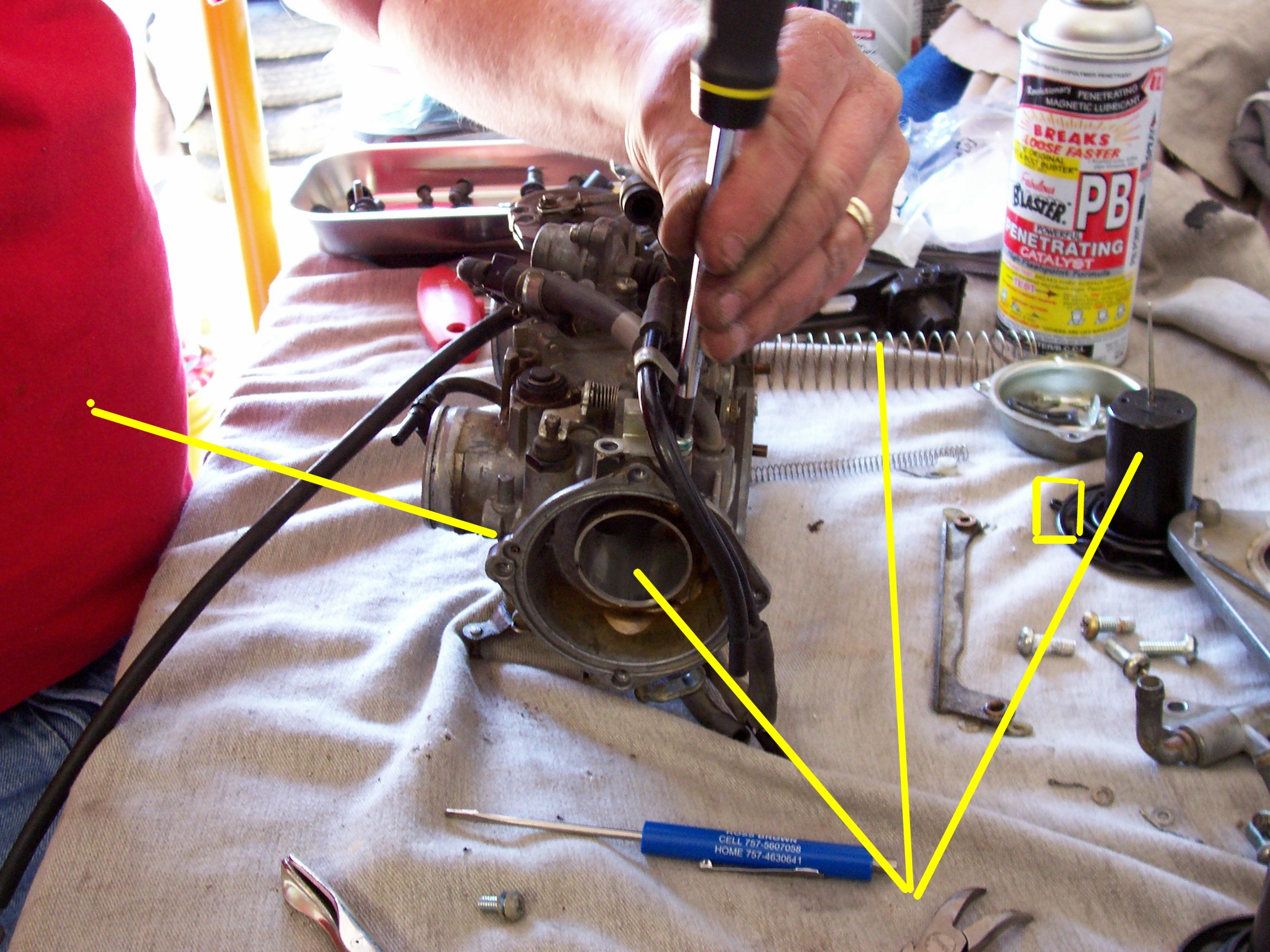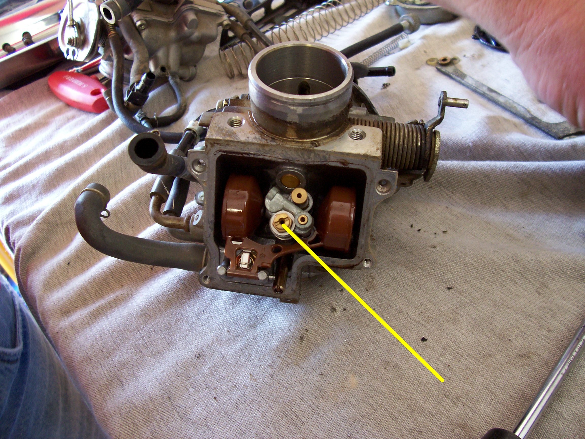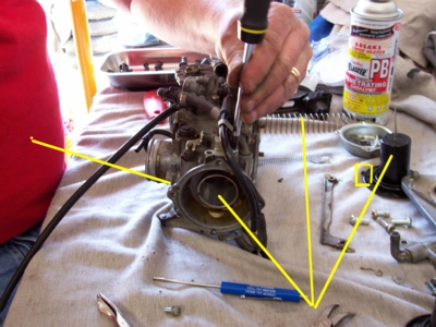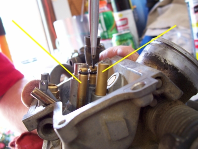 Here a screw driver is being used to remove the idle jet. These two jets (pointed to by the yellow lines) are pressed in and are not to be removed.