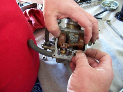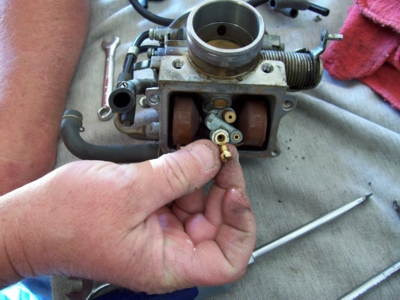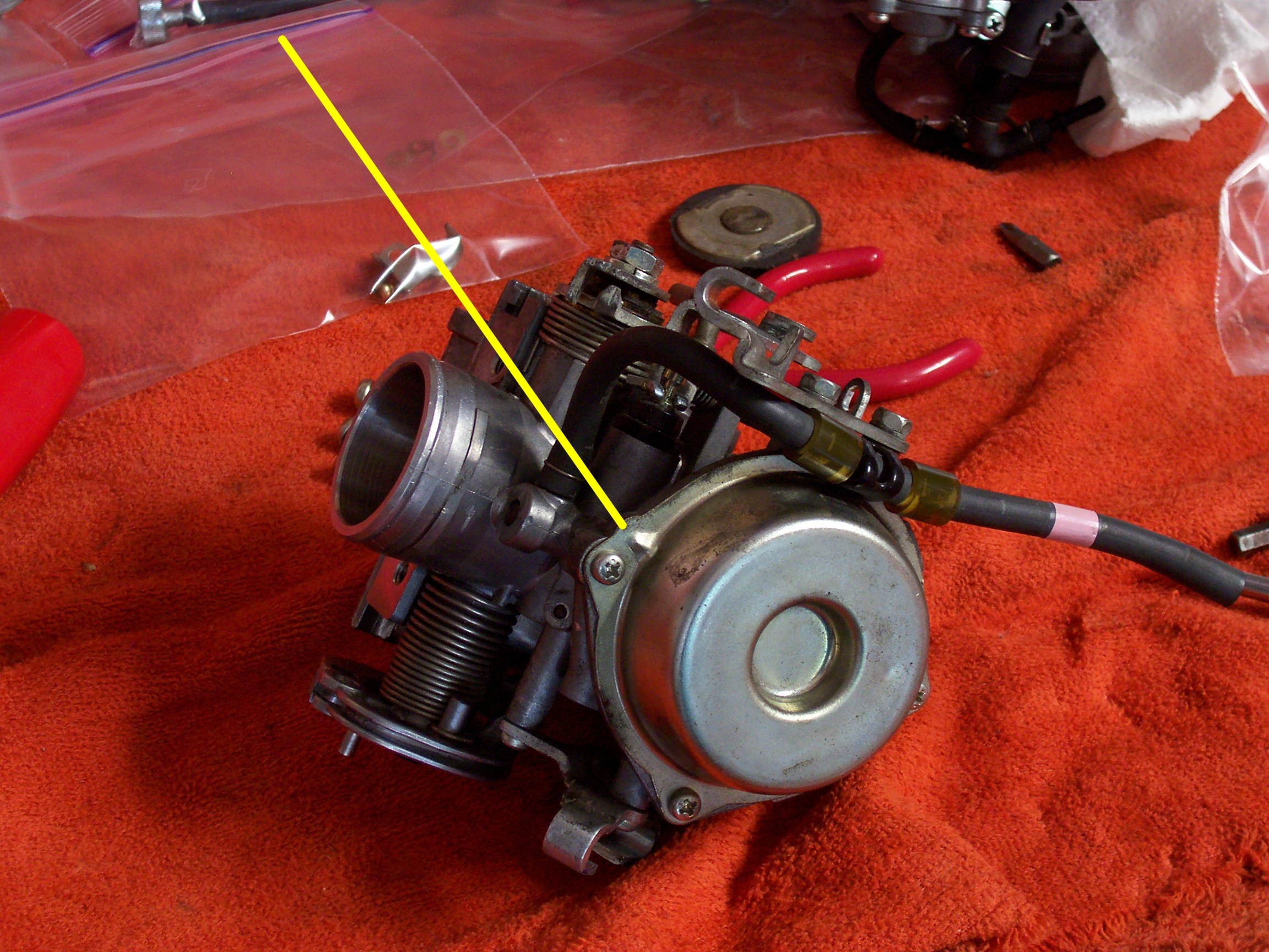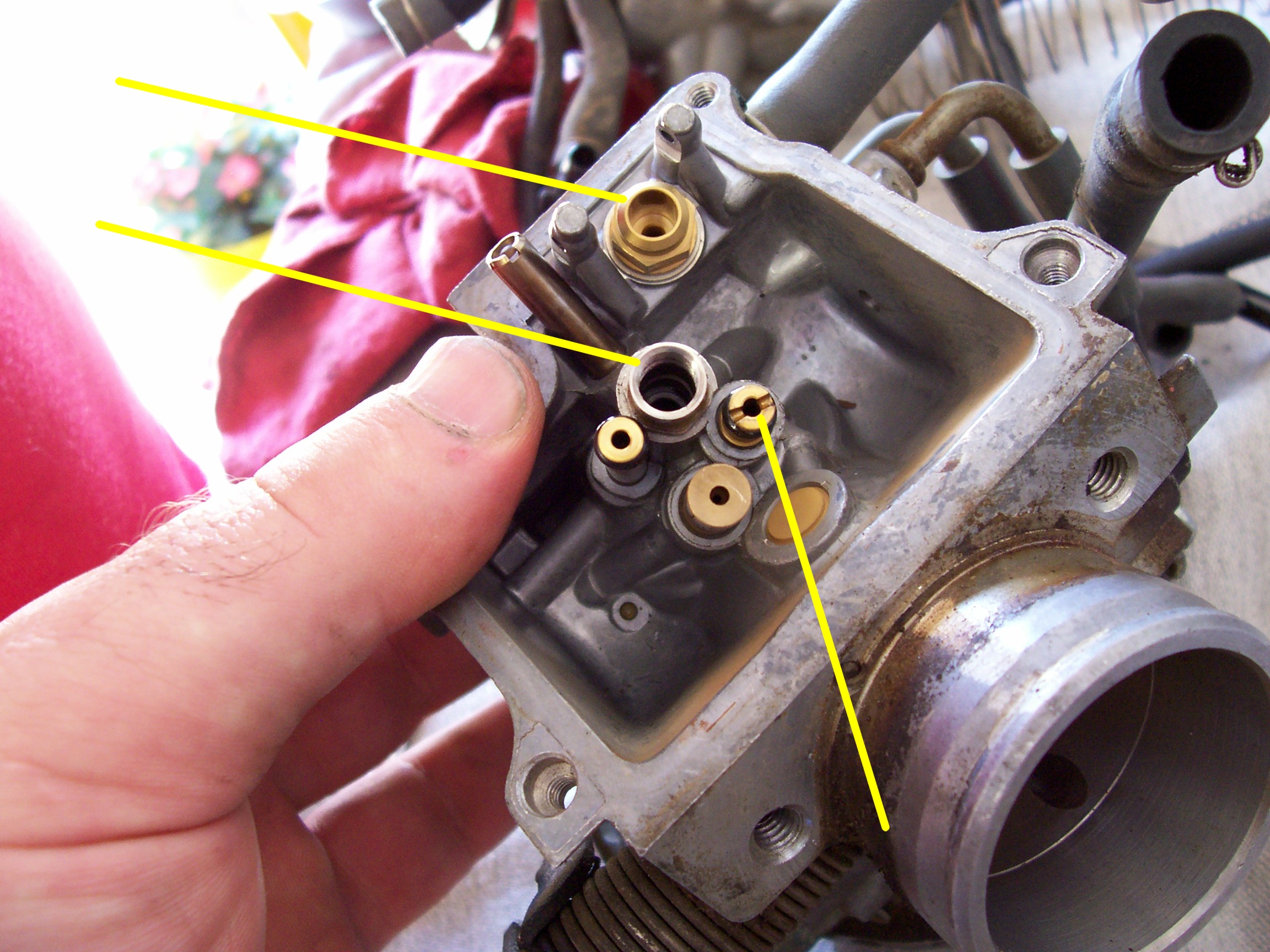 The lower most arrow points to the low speed jet. The middle arrow points to the main jet housing. The uppermost arrow points to the float valve seat.