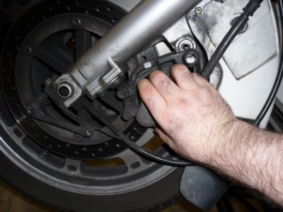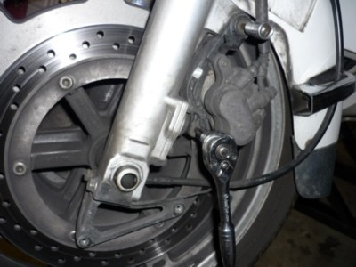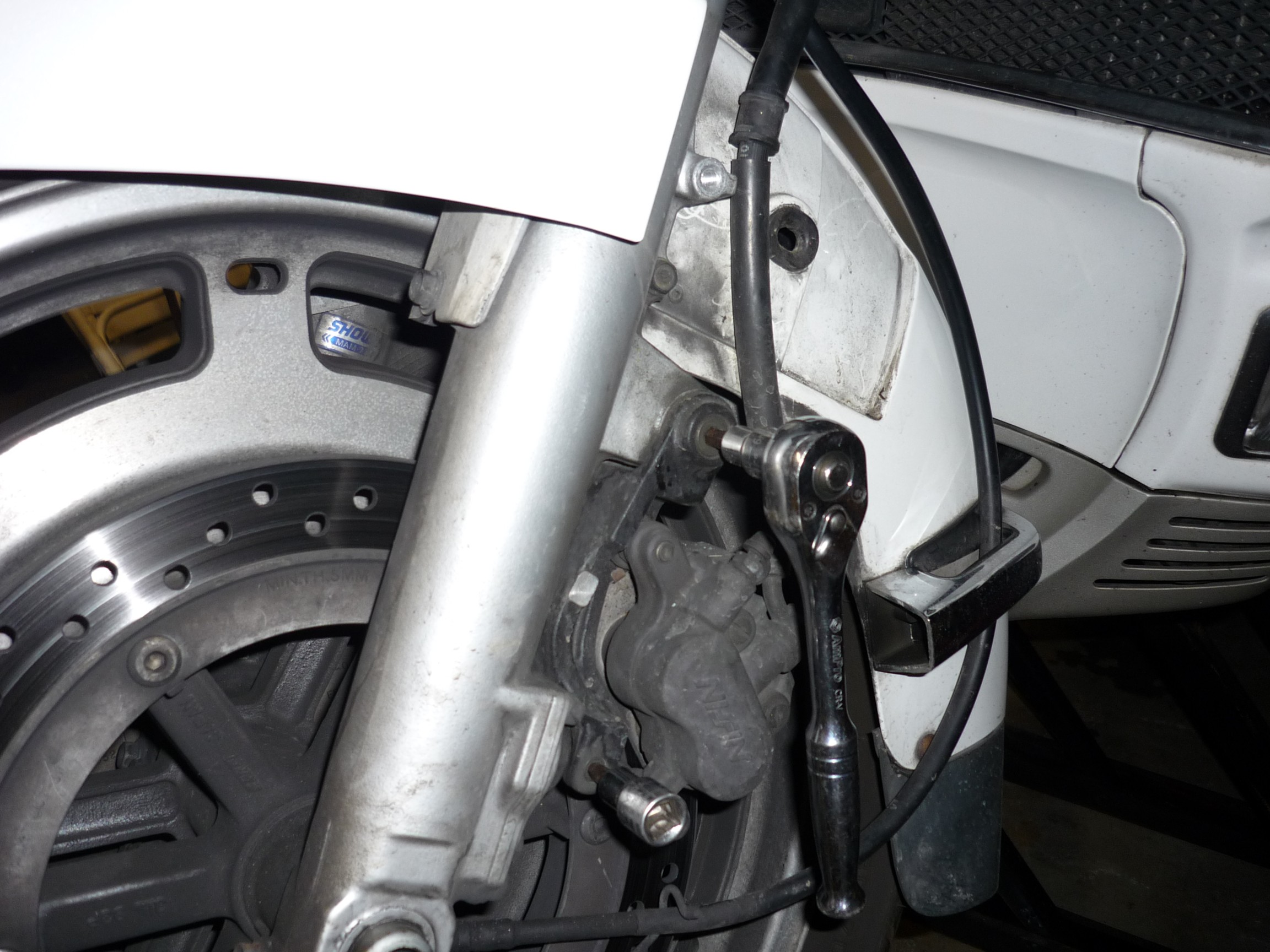 On the right side, I used a screw driver between the caliper and the fork tube to protect the anti-dive. |