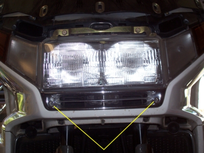 There is a screw on each end of the front chrome trim. It is located under the mirror rubber boot. So starting with the mirrors, loosen the rubber boot from the bezel and then remove the bezel. You might be able to work the bezel around and remove the needed screw with out removing the bezel, however, I have enough chips and scratches in mine, so I removed it.|