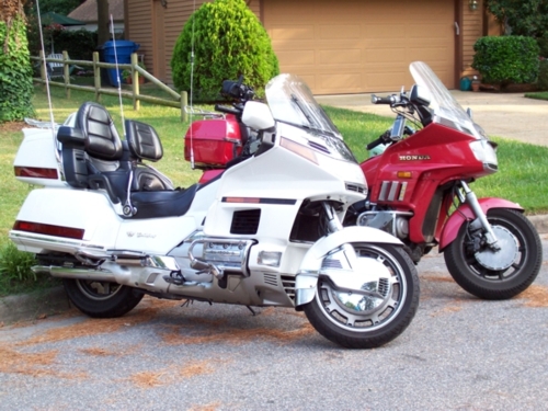 These are my bikes. The red one is a 1985 Honda Goldwing 1200 Interstate.
