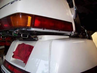 The piece is now removed, exposing the top edge of the saddlebags. |