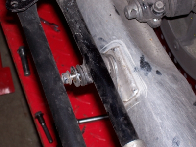 Remove the lower shock bolt. (this also holds the caliper bracket in place.)